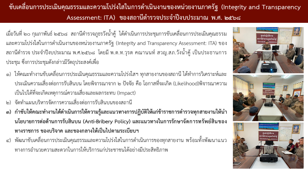 เมื่อวันที่ 20 กุมภาพันธ์ 2568 สถานีตำรวจภูธรวังน้ำคู้ ได้ดำเนินการประชุมการขับเคลื่อนการประเมินคุณธรรม และความโปร่งใสในการดำเนินงานของหน่วยงานภาครัฐ (Integrity and Transparency Assessment: ITA) ของสถานีตำรวจ ประจำปีงบประมาณ พ.ศ.2568 โดยมี พ.ต.ท.วุรต คณานนท์ สวญ.สภ.วังน้ำคู้ เป็นประธานการประชุม ซึ่งการประชุมดังกล่าวมีวัตถุประสงค์เพื่อ