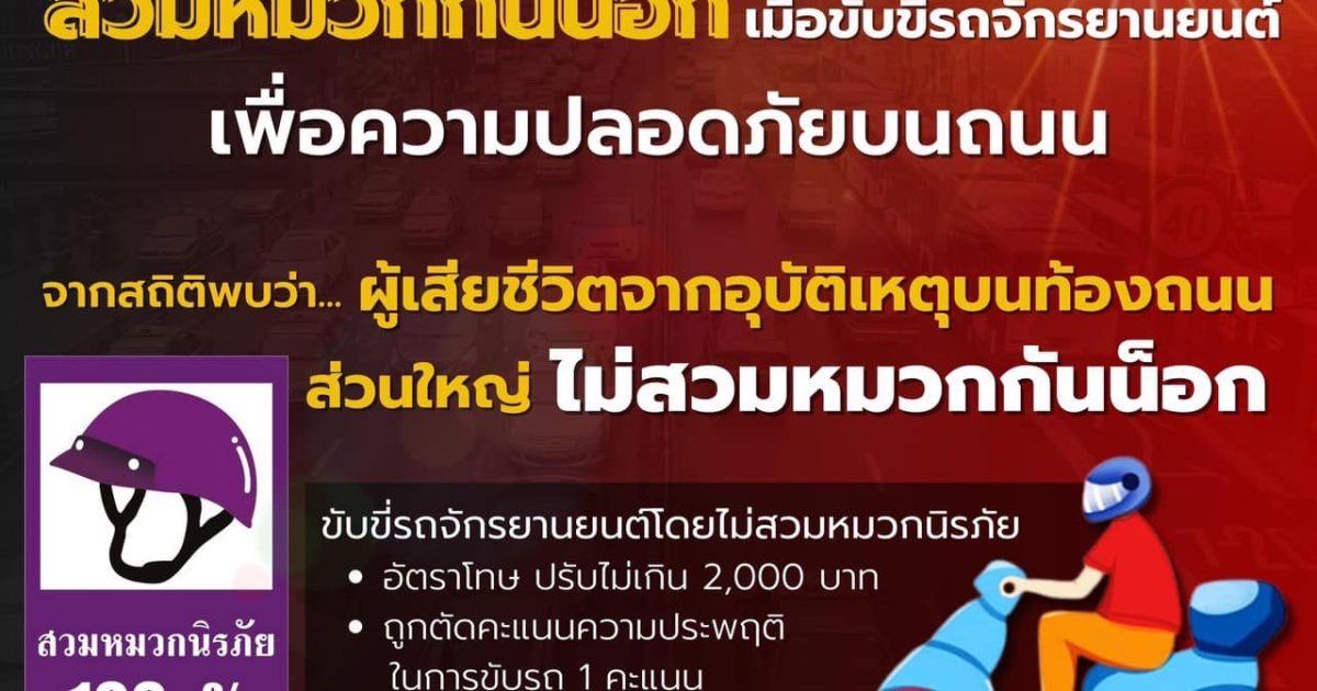จากสถิติอุบัติเหตุทางถนนของระบบฐานข้อมูลอุบัติเหตุทางถนน ( PRS ) สำนักงานตำรวจแห่งชาติ พบว่าผู้เสียชีวิตที่ไม่สวมหมวกนิรภัย หรือหมวกกันน็อกมีสัดส่วนสูงกว่าผู้ที่สวมหมวกนิรภัยอย่างชัดเจน จึงขอให้ผู้ขับขี่ทุกคนคำนึงถึงความปลอดภัย