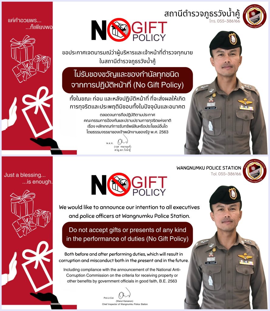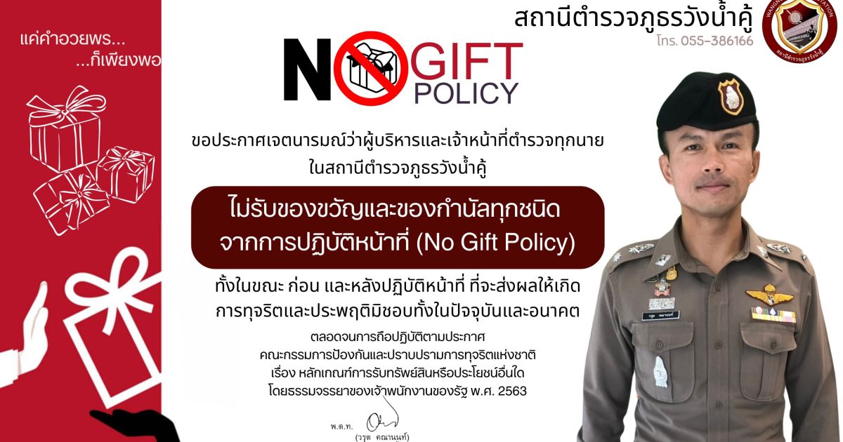 สถานีตำรวจภูธรวังน้ำคู้ ขอประกาศเจตนารมณ์ว่าผู้บริหารและเจ้าหน้าที่ตำรวจทุกนาย ในสถานีตำรวจภูธรวังน้ำคู้ ไม่รับของขวัญและของกำนัลทุกชนิดจากการปฏิบัติหน้าที่ (No Gift Policy)