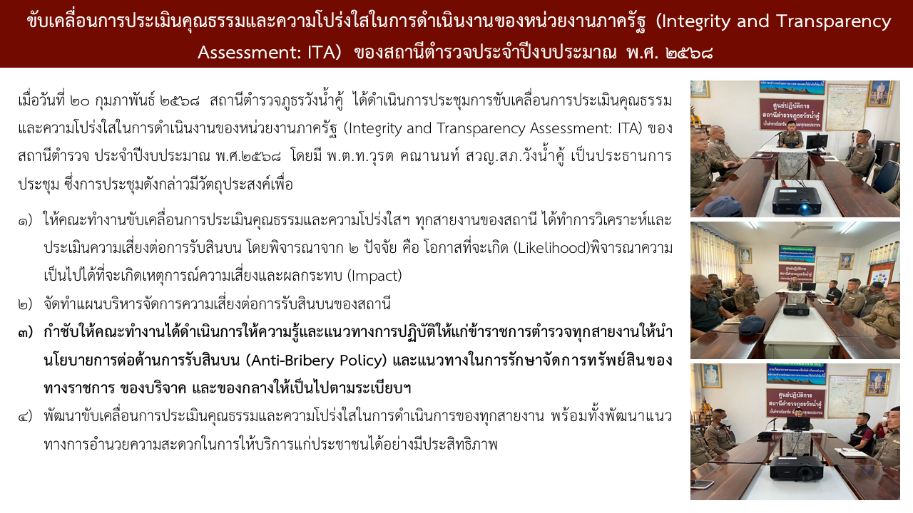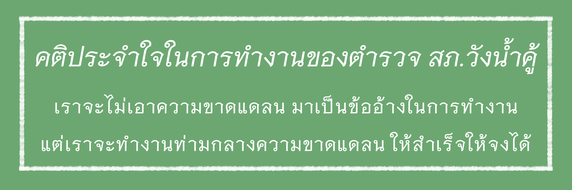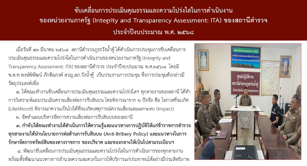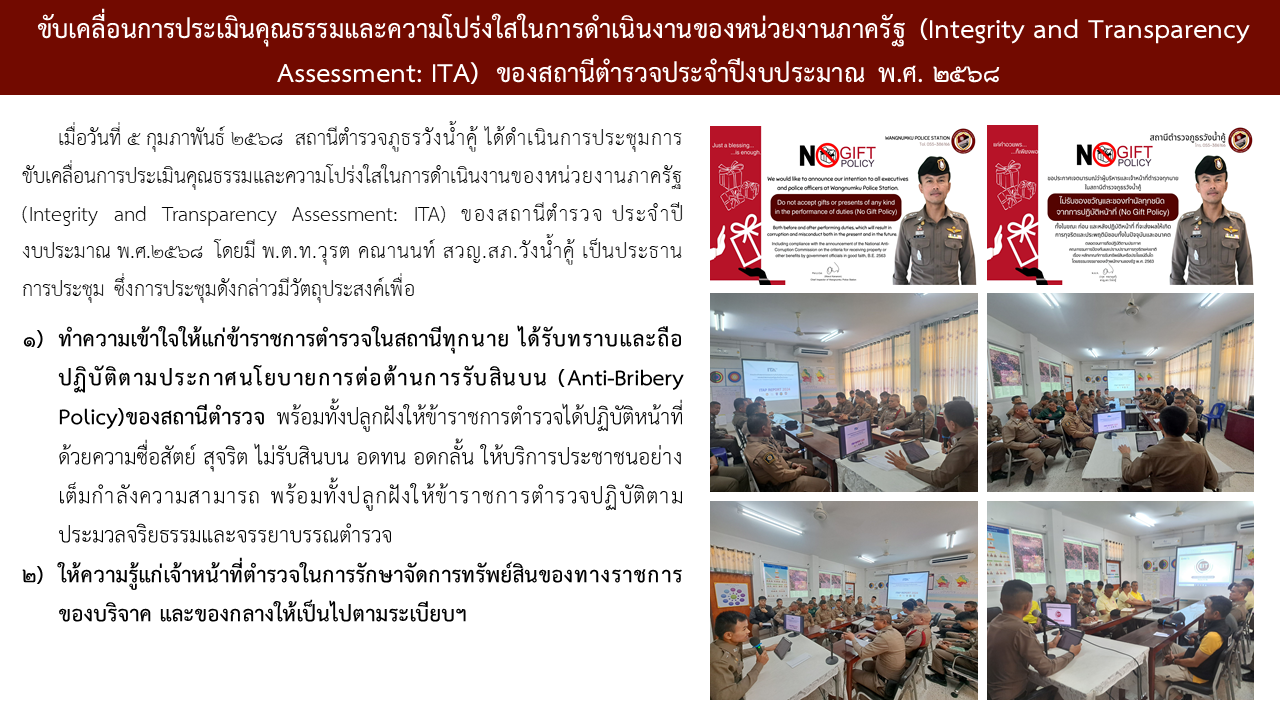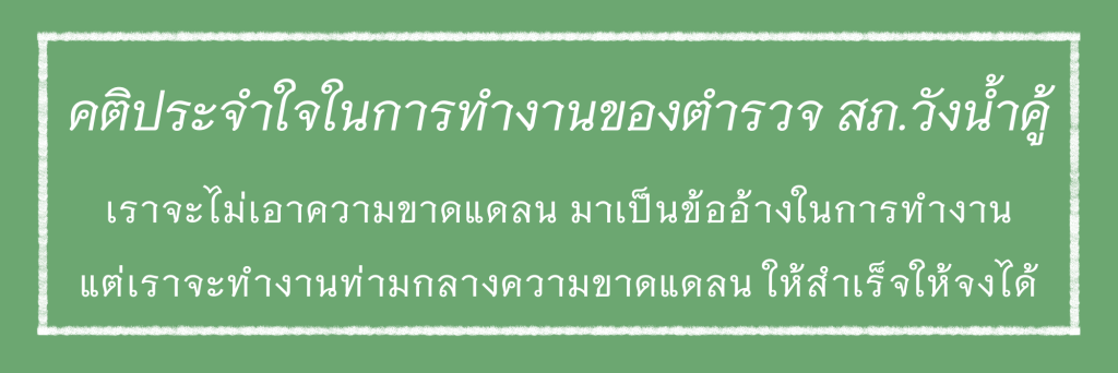 สถานีตำรวจภูธรวังน้ำคู้ ขอประกาศเจตนารมณ์ว่าผู้บริหารและเจ้าหน้าที่ตำรวจทุกนาย ในสถานีตำรวจภูธรวังน