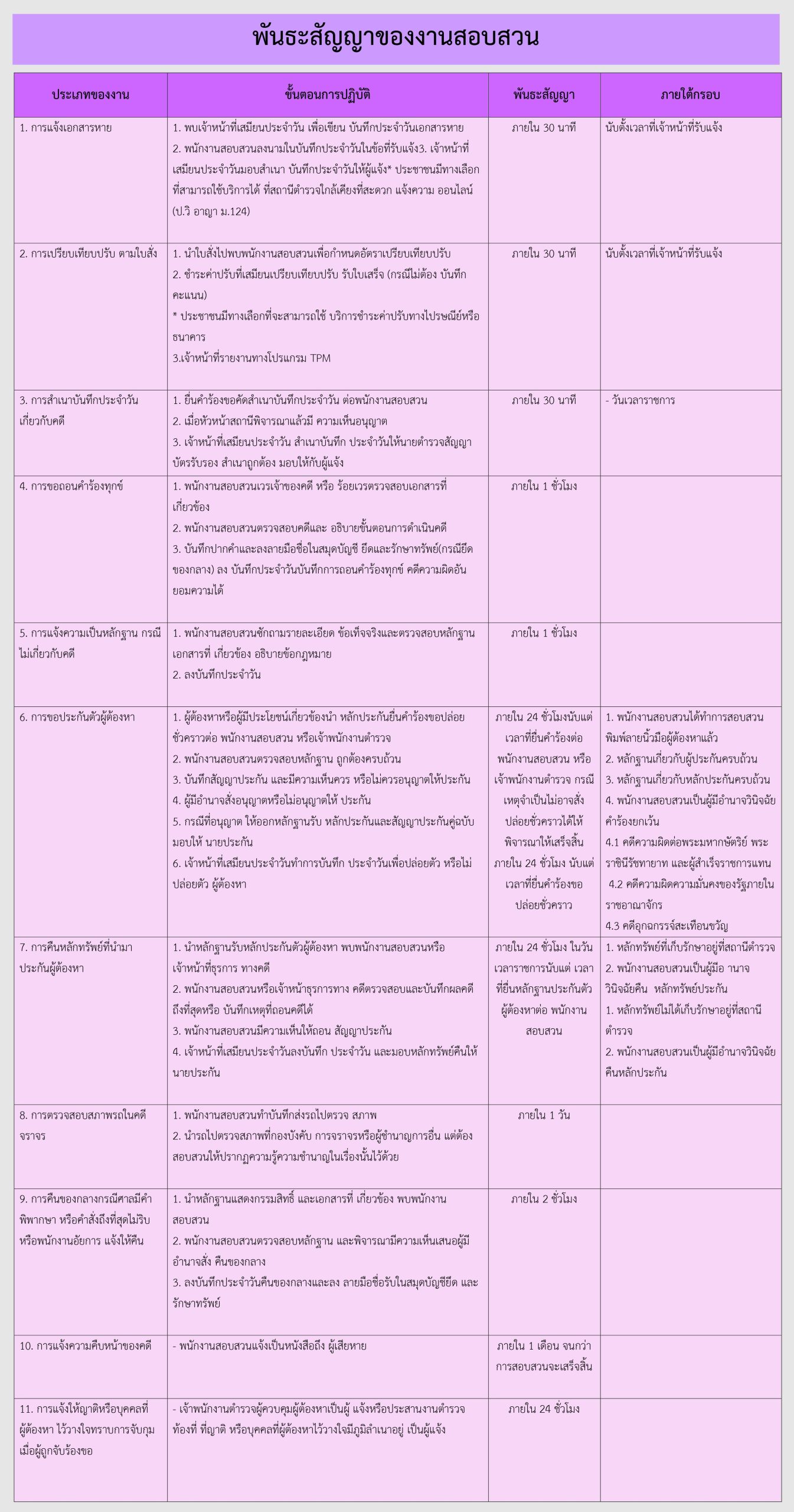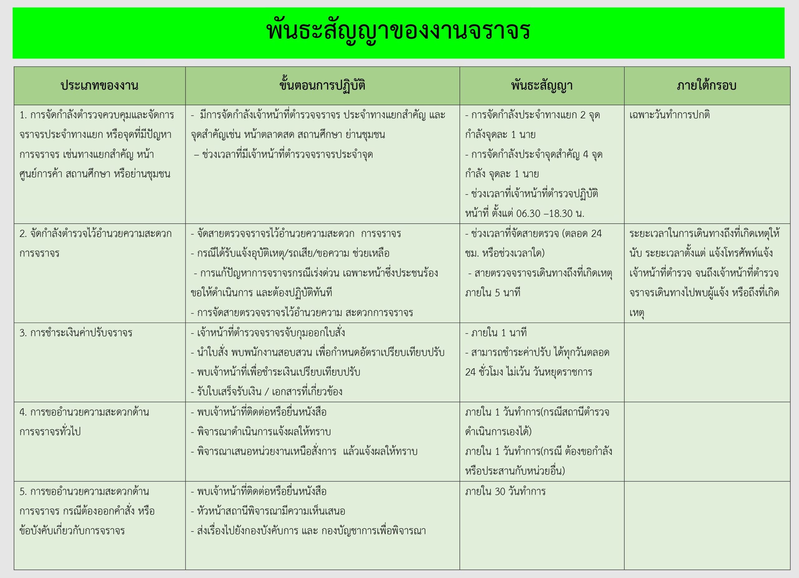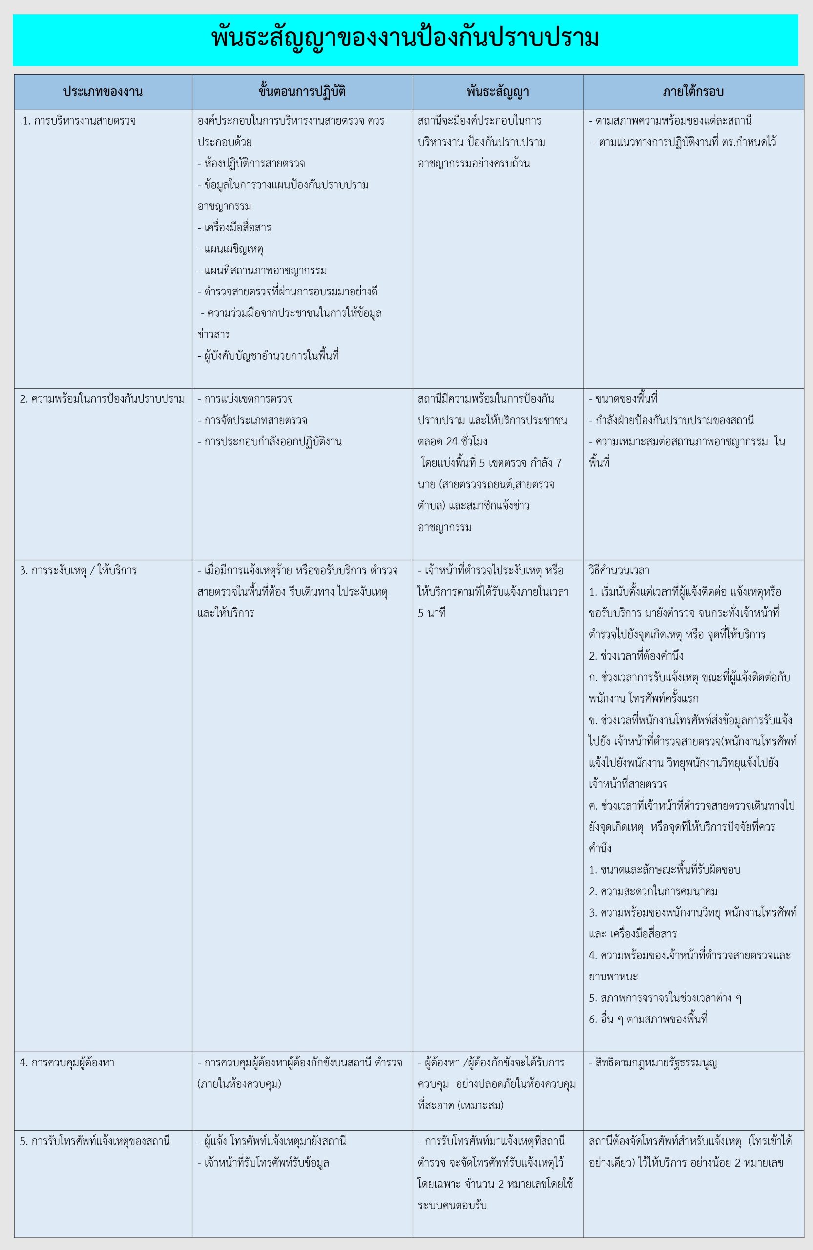 วิธีการกำหนดพันธะสัญญาของสถานีตำรวจในการให้บริการประชาชนตามกรอบกิจกรรมของ ตร. กรอบกิจกรรมงานด้านต่างๆ ตร.ได้กำหนดกรอบกิจกรรมของสถานีตำรวจที่จะต้องนำไปกำหนดพันธะสัญญาการให้บริการประชาชนซึ่งเป็นส่วนหนึ่งของแนวทางในการผลักดันนโยบายลงสู่ภาคปฏิบัติโดยมีเป้าหมายที่มุ่งเน้นให้ สถานีตำรวจแต่ละสถานีให้คำมั่นสัญญาต่อประชาชนผู้รับบริการในพื้นที่อย่างเป็นรูปธรรมภายใต้ระบบการทำงานและทรัพยากรที่มีอยู่ในแต่ละพื้นที่ในหน้างานด้านต่างๆของสถานีตำรวจซึ่งจะถือเป็นข้อผูกพันในการปฏิบัติเพื่อให้บริการประชาชน กรอบกิจกรรมในงานด้านต่าง ๆ ของสถานีตำรวจ มีด้วยกัน 5 ด้าน ดังนี้ 1.งานธุรการและอํานวยการ 2.งานป้องกันปราบปราม 3.งานจราจร 4.งานสอบสวน 5.งานสืบสวน