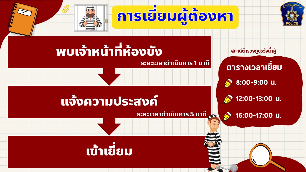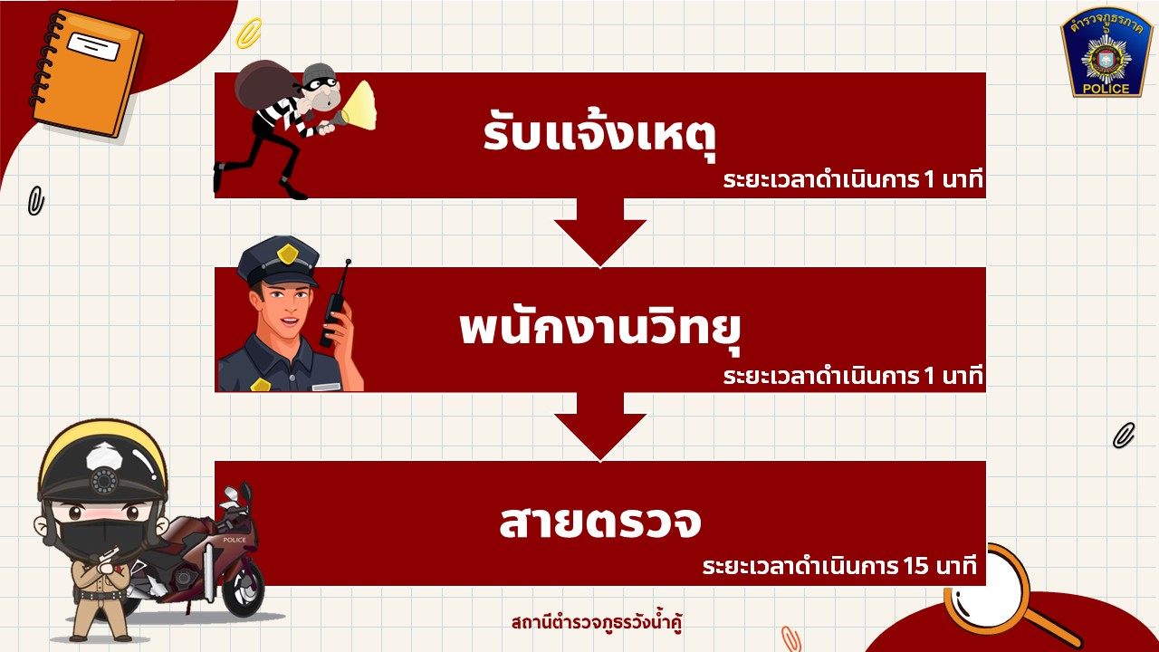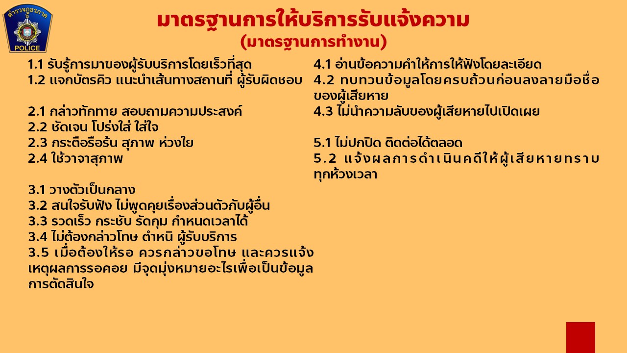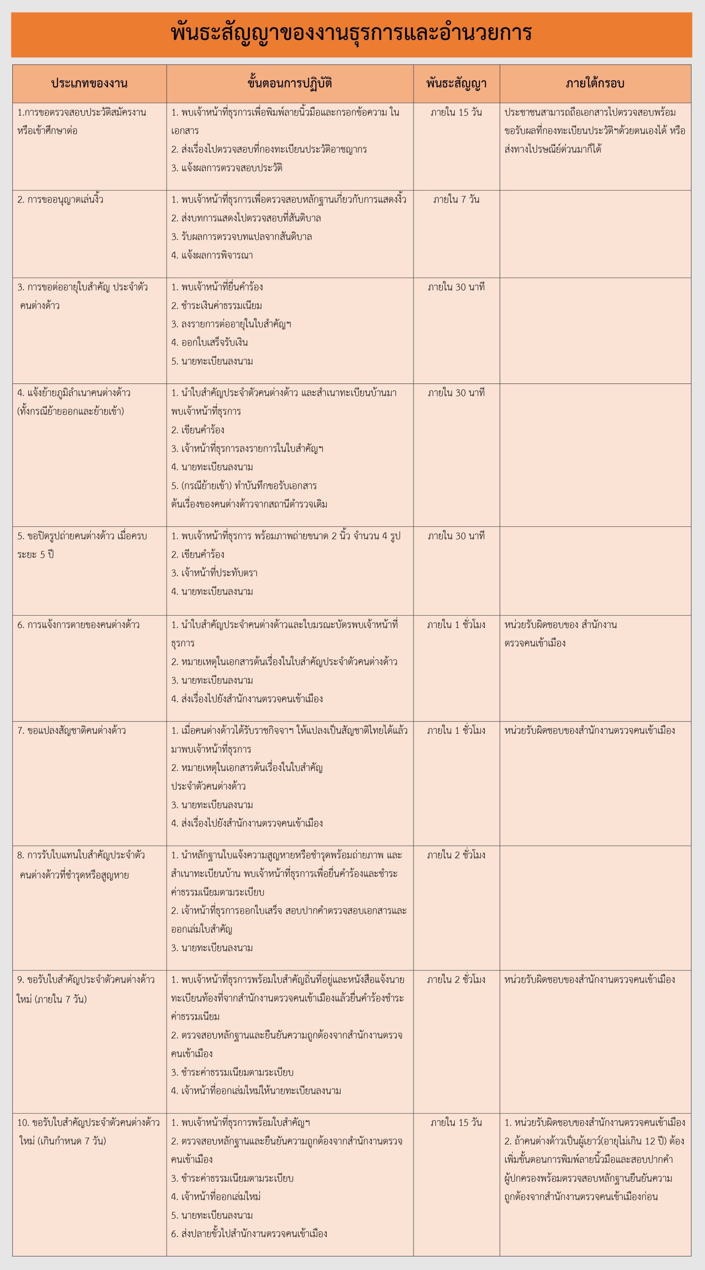 วิธีการกำหนดพันธะสัญญาของสถานีตำรวจในการให้บริการประชาชนตามกรอบกิจกรรมของ ตร. กรอบกิจกรรมงานด้านต่างๆ ตร.ได้กำหนดกรอบกิจกรรมของสถานีตำรวจที่จะต้องนำไปกำหนดพันธะสัญญาการให้บริการประชาชนซึ่งเป็นส่วนหนึ่งของแนวทางในการผลักดันนโยบายลงสู่ภาคปฏิบัติโดยมีเป้าหมายที่มุ่งเน้นให้ สถานีตำรวจแต่ละสถานีให้คำมั่นสัญญาต่อประชาชนผู้รับบริการในพื้นที่อย่างเป็นรูปธรรมภายใต้ระบบการทำงานและทรัพยากรที่มีอยู่ในแต่ละพื้นที่ในหน้างานด้านต่างๆของสถานีตำรวจซึ่งจะถือเป็นข้อผูกพันในการปฏิบัติเพื่อให้บริการประชาชน กรอบกิจกรรมในงานด้านต่าง ๆ ของสถานีตำรวจ มีด้วยกัน 5 ด้าน ดังนี้ 1.งานธุรการและอํานวยการ 2.งานป้องกันปราบปราม 3.งานจราจร 4.งานสอบสวน 5.งานสืบสวน