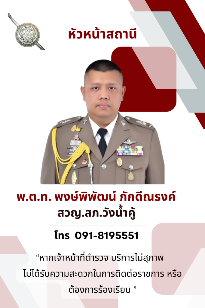 สถานีตำรวจภูธรวังน้ำคู้ ตั้งอยู่ทางทิศใต้ของอำเภอเมืองพิษณุโลก ห่างจากอำเภอเมืองพิษณุโลก ประมาณ 20 กิโลเมตร พื้นที่ทั่วไปเป็นที่ราบลุ่ม 2 ฝั่งแม่น้ำน่าน โดยมีแม่น้ำไหลผ่านในแนวเหนือ-ใต้ และมีพื้นที่รับชอบติดต่อกับพื้นที่ข้างเคียงดังนี้.- ทิศเหนือ ติดต่อกับตำบลท่าโพธิ์(ที่ตั้ง ม.นเรศวร) ตำบลบึงพระ อำเภอเมืองพิษณุโลก ทิศใต้ ติดต่อกับตำบลบ้านไร่ อำเภอบางกระทุ่ม จังหวัดพิษณุโลก ทิศตะวันออก ติดต่อกับตำบลท่าตาล อำเภอบางกระทุ่ม จังหวัดพิษณุโลก ทิศตะวันตก ติดต่อกับตำบลวังอีทก อำเภอบางระกำ จังหวัดพิษณุโลก
